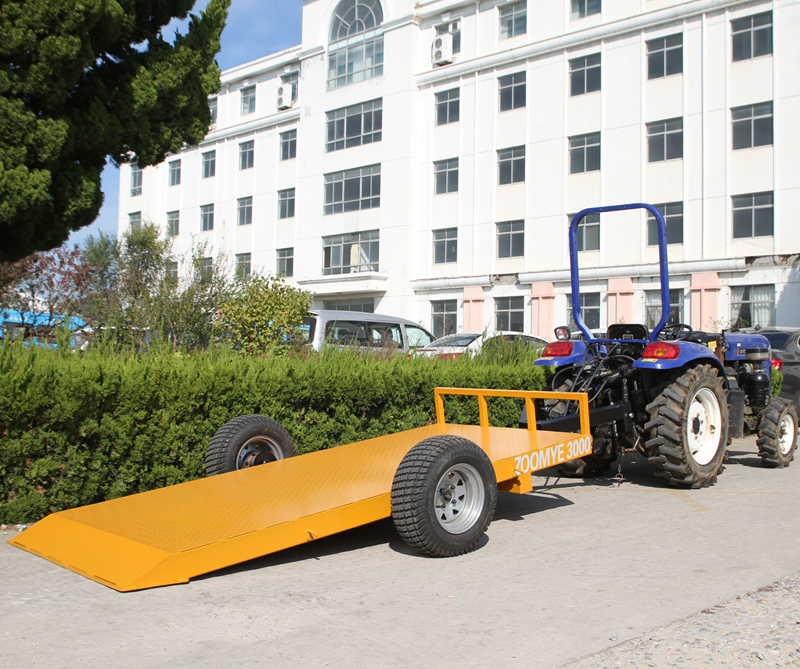 Chassis lifting transport trailer is a multi-purpose transport equipment developed by Zoomye Company to solve the problem of slow transition and difficult loading and unloading of farm crawler type equipment (crawler orchard management machine, crawler lawn mower, crawler excavator, crawler type pesticide sprayer, crawler type operation platform, etc.). It can flexibly load and unload various materials without forklift assistance. The trailer axle can be lifted and lowered under the action of the hydraulic cylinder (the lifting range can be customized), and the tail of the trunk bottom plate can fit perfectly with the ground under the action of the cylinder, forming a small included angle with the ground, which is convenient for the crawler type equipment to move up and down freely. Other wheeled equipment, fruit baskets, materials, etc. can also be loaded and unloaded freely through the trailer without forklift assistance.